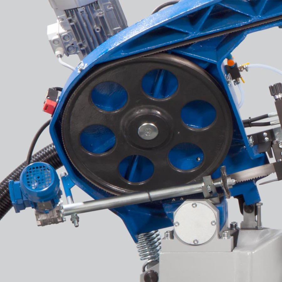 Bánh đà dẫn động có đường kính lớn kết hợp với cụm đầu kẹp gắn mảnh hợp kim đảm bảo độ chính xác khi cắt cũng như tuổi thọ lâu dài của băng máy cưa.