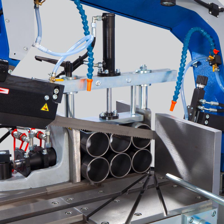 Khi chuyển sang chế độ thủ công, bạn có thể điều khiển từng chức năng riêng biệt. Máy được trang bị hệ thống thủy lực công nghiệp có hiệu suất cao cho phép điều chỉnh áp lực kẹp của ê tô. Sự kết hợp này cùng với việc điều khiển thủy lực đưa lưỡi cưa vào vị trí cắt sẽ cải thiện hiệu suất cắt, đặc biệt với các lô lớn và vật liệu đặc, chất lượng cao. Chỉ cần bấm một nút nhấn để thực hiện chu trình cắt hoàn chỉnh: Kẹp vật liệu - Khởi động lưỡi cưa và hệ thống làm mát - Cắt - Dừng lưỡi cưa và hệ thống làm mát - Nâng cần máy về vị trí ban đầu và mở kẹp ê tô. Hiệu suất cắt tối đa được duy trì nhờ khả năng thiết lập tốc độ lưỡi cưa tối ưu bằng biến tần từ 15 đến 90 m/phút, góp phần quan trọng vào độ chính xác cắt và tuổi thọ lưỡi cưa.